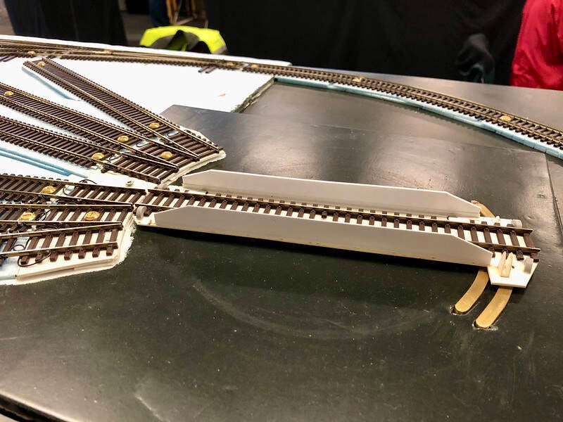 Twee verschillende schaduwstations. De eerste drie foto's een schaduwstation met mogelijkheid om via het Trainsafe transport systeem locomotieven / treinen op de modelspoorbaan te plaatsen en er weer af te halen. De laatste foto toont een ander model schaduwstation.